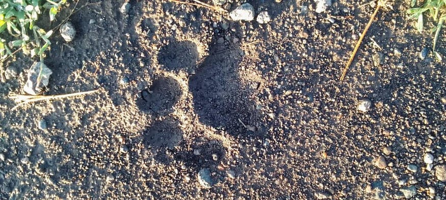 On my way to my spot, I noticed fresh big cat footprints on the wet, muddy road. The large paw prints stood out, and I knew they weren’t from a dog. I suspected they might belong to a lion or a large hyena. So, I took photos of the prints and decided to follow them to see where they led. Further along the same road, I spotted a smaller print near where the larger ones disappeared.